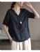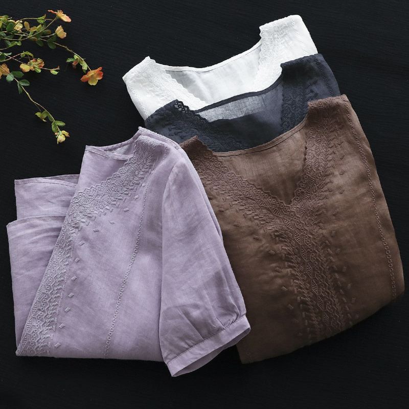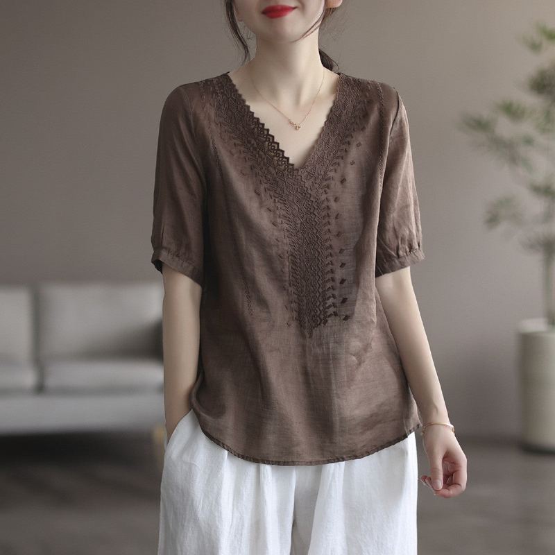 Naisten Kesäkirjonta V-kaula-aukkoinen Pellava T-paita
