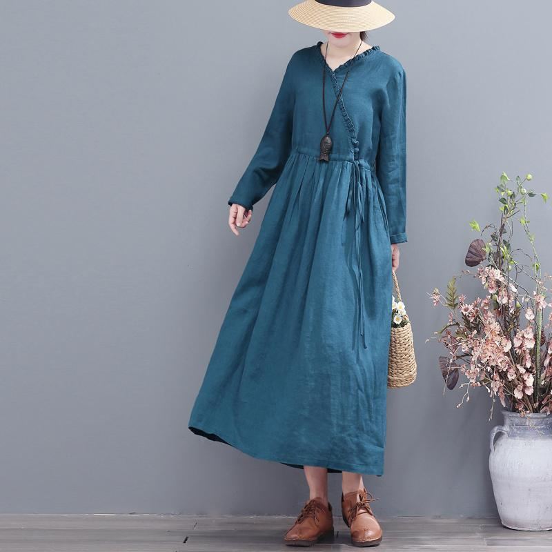 Syksyinen Retro Väljä Rento Pellavamekko V-kaula-aukolla